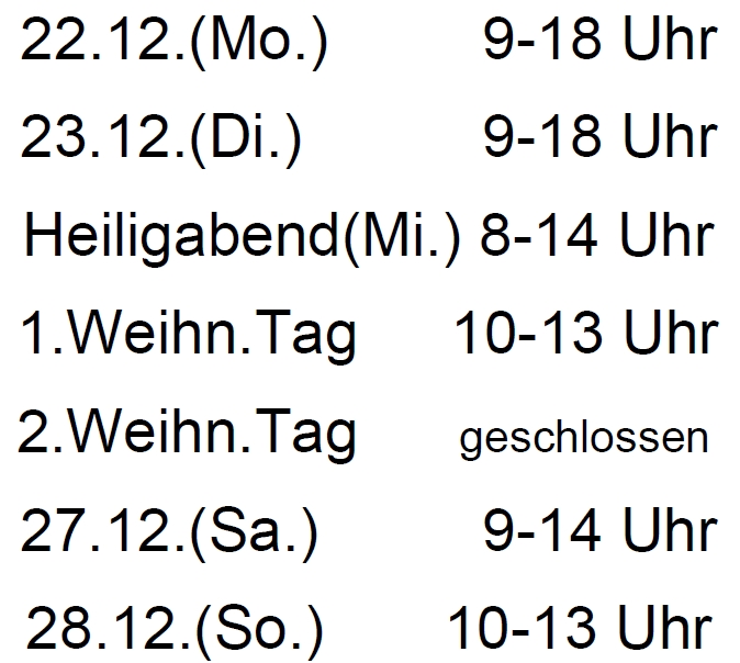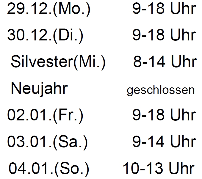 | Dienstag bis Freitag | 09.00 – 18.00 Uhr |